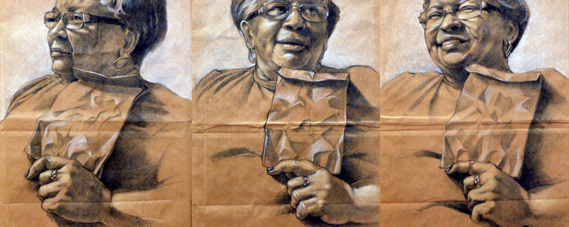 Cozart then went on to discuss the artwork itself. He varied his work, creating paintings, drawings and mixed media collages. Much of his work is done on brown paper bags because he wanted to utilize the shade of the bag for skin tone. He also placed quotes from the person’s conversation on the flaps of the paper bags. Like Basquiat’s eye-catching crossed out word art, Cozart made certain words larger through the speaker’s inflection. Together, he made three bags for one person, featuring various facial expressions from their conversation. Cozart’s inspiration for this conversational collage came from Henry Pekar, the cartoonist for the comic American “Splendor,” which shows the mundane life of Pekar himself. Some of Pekar’s work involved a head shot of him speaking to the audience. This is exactly what Cozart was going for in his Pass/Fail series.
