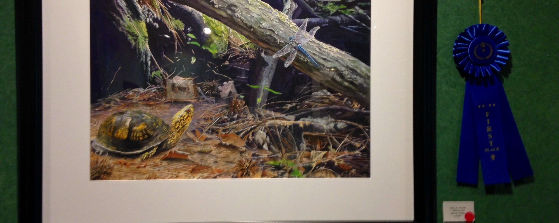 We began by taking note of the pieces still hanging that had ribbons beside them, focusing our attention on the one labeled “first place:” a watercolor painting entitled “Hello Again” by Greensboro artist Nancy Paden. It featured a realistic turtle that we kept coming back to appreciate as we circled the exhibition. Mayshark later informed us that turtles feature heavily in much of Paden’s work.