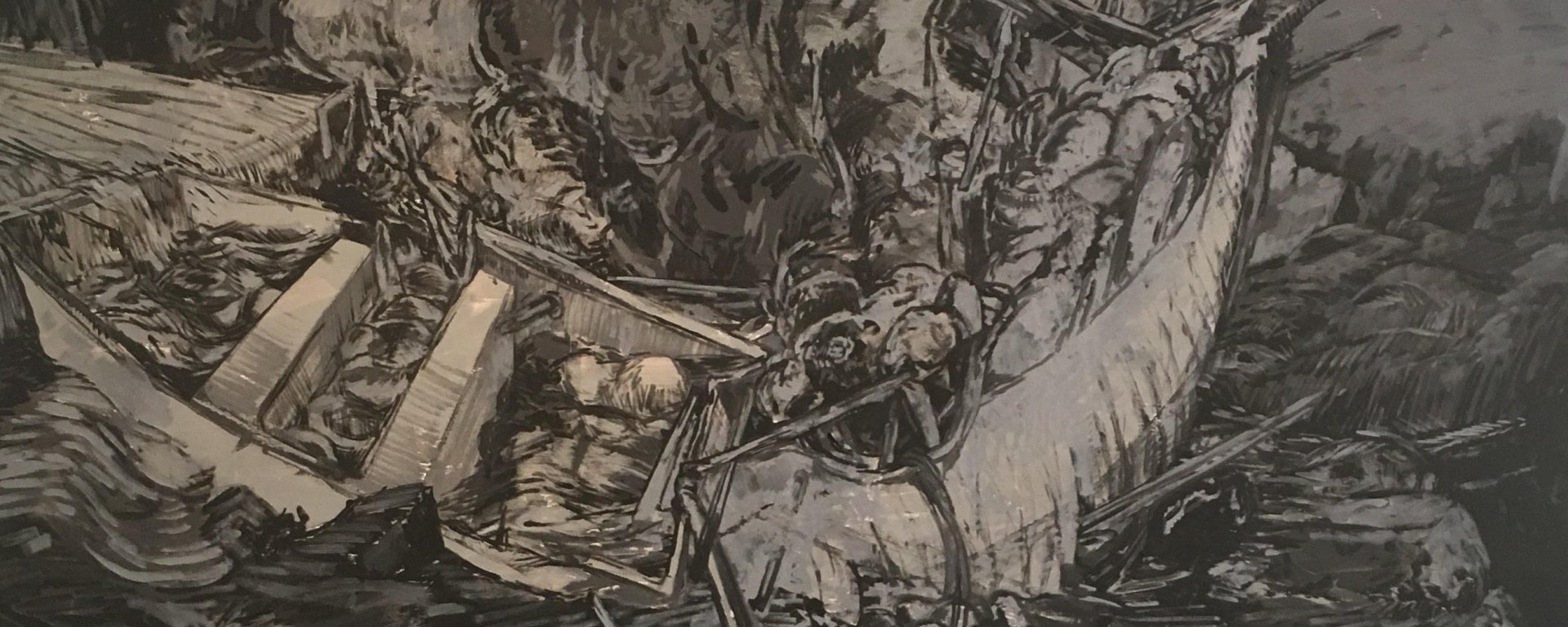 The first piece that struck me when seeing this collection was an oil on canvas by Mariam Aziza Stephan, who is a painting professor. This particular work is entitled “Explosions & Falls,” and is done all in black and gray tones, making it appear shadowy and ominous. The focus point of the painting is a wrecked boat on what must be the ocean. The painting has many sharp images of wood and splinters coming from the boat. The splinters of wood extend out past the boat, making it look like it may have collided with another boat. This painting achieves a sense of discomfort, but it is also very intriguing to look at because one immediately wants to know what happened in the painting.
