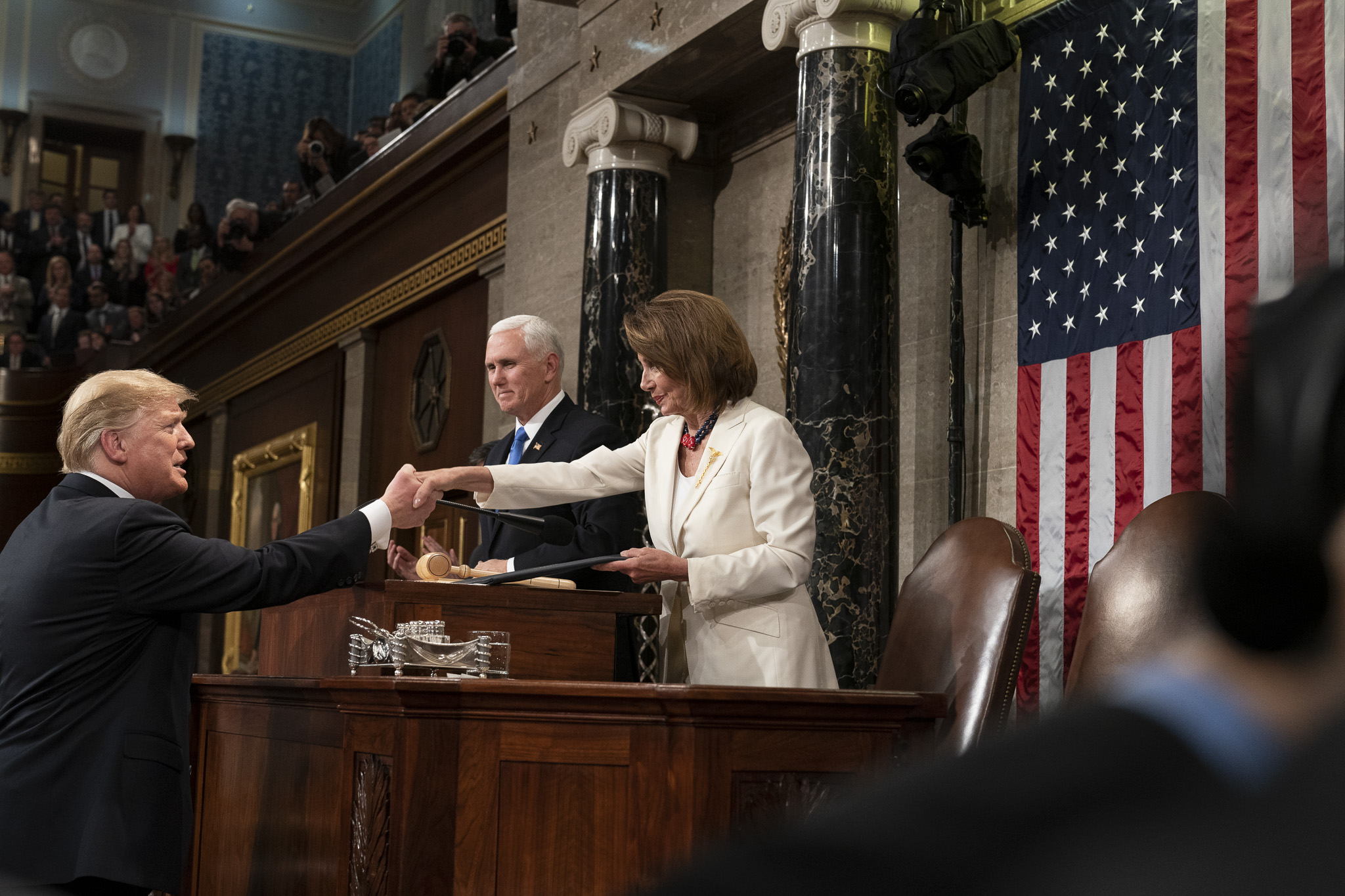 After introducing a series of guests, including former astronaut Buzz Aldrin, a police officer shot in last year’s Pittsburgh synagogue massacre and the family of a couple killed by an undocumented immigrant, President Trump turned his attention to the women of Congress. Pelosi, along with many House Democratic women, wore white, the color of the suffrage movement, to honor the 131 women recently sworn in to Congress—the largest number in U.S. History.