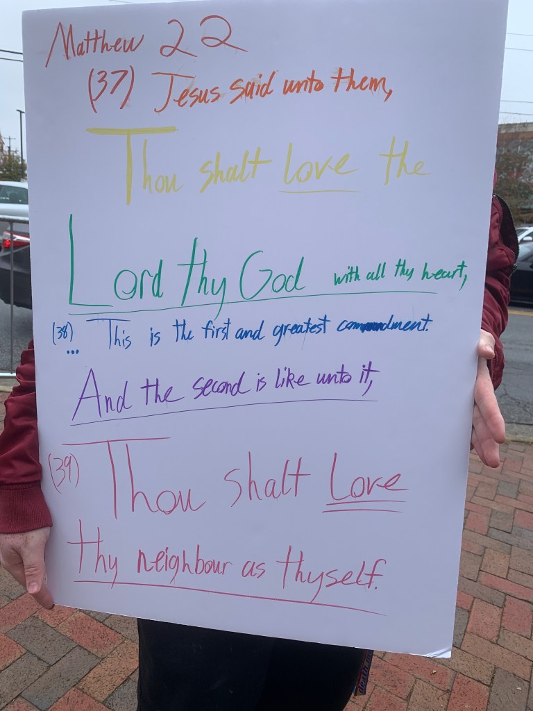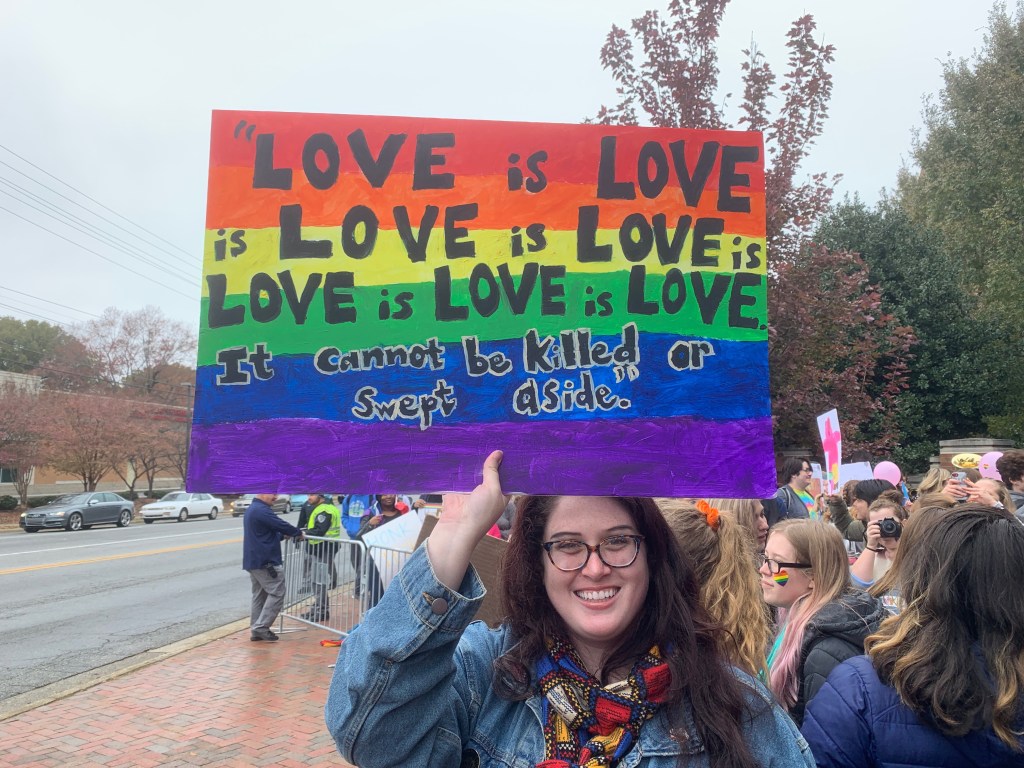 “It’s pretty amazing to see this many people from our community who didn’t know each other becoming friends in a common issue against three people who show up to protest, saying a message from God that many of us do not agree with anymore,” said Jason Harvey, Pastor at College Place UMC. “Ultimately, God is a God of love and forgiveness and mercy, so we’re appreciative of that and amazed at God’s creation and who God chooses to create and how God chooses to create them.”