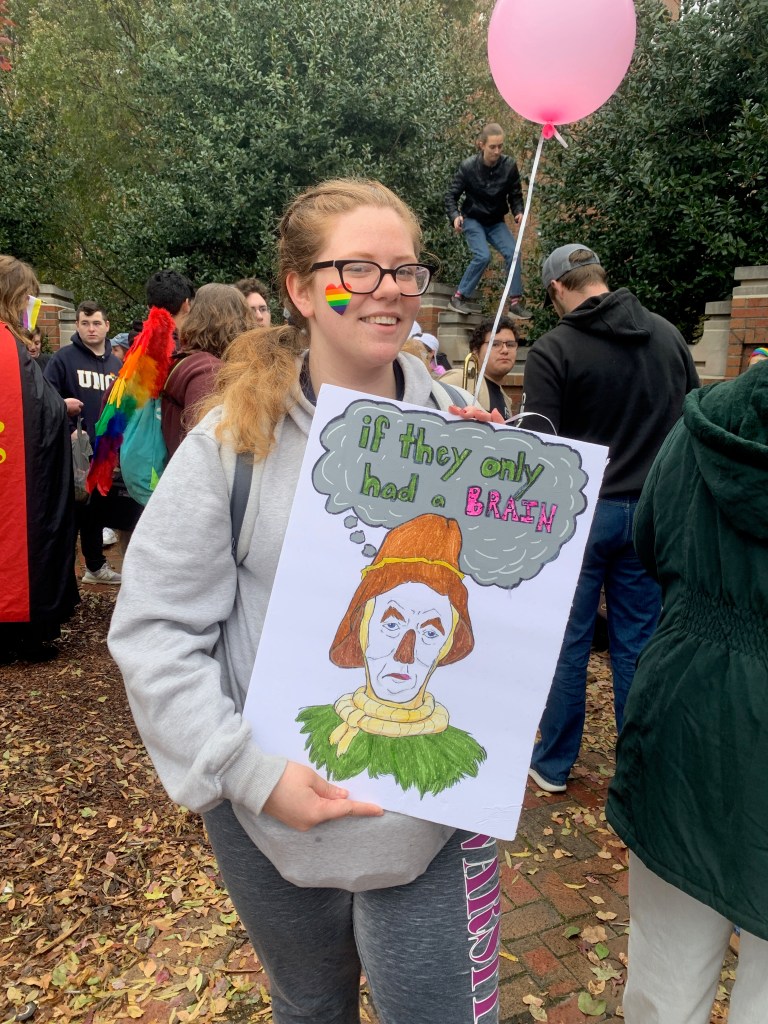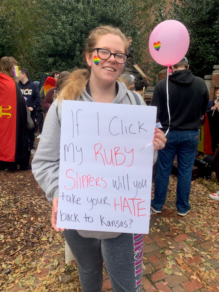 “I’ve got candy to pass around because why not—it’s a miniature pride anyway,” said Indigo Orlando, a student at UNCG. “[Being here] helps show that there’s a large supportive community here at UNC-‘Gay,’ as we’re very well known.”