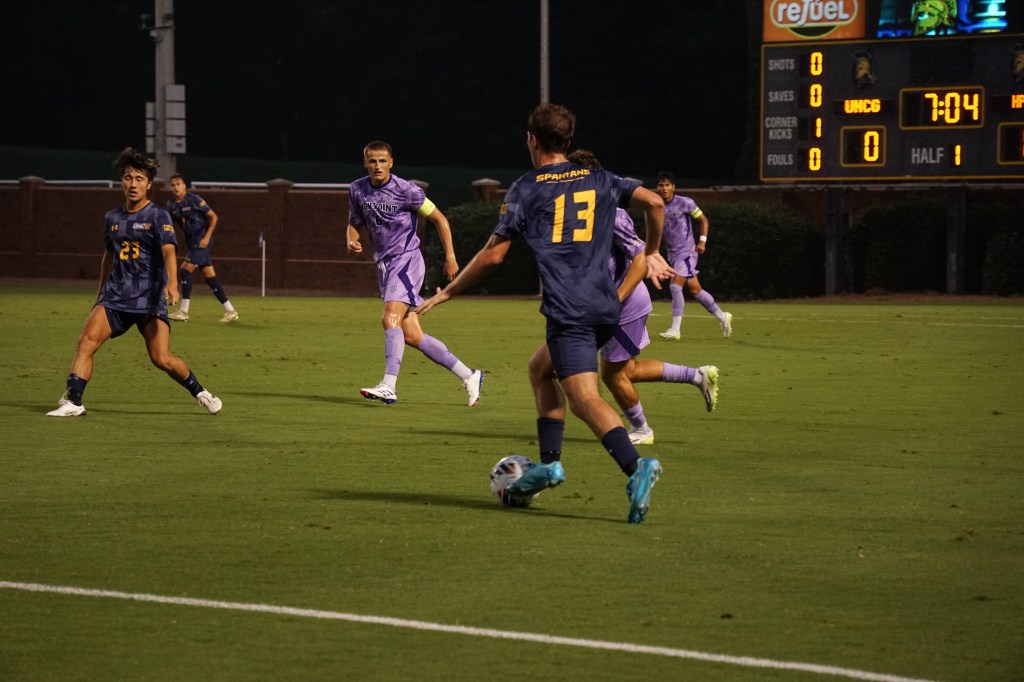 Drama unfolded on both sides of the field in the first ten minutes. The favored Mountaineers were the first to strike, with Marcus Caldeira scoring at 04:48, assisted by Isaac Scheer. Despite being down 0-1 within five minutes, our UNCG Spartans didn’t waver. They swiftly responded, and in the 6th minute, forward Arnaud Tattevin equalized with an assist from midfielder Yoshiya Okawa.