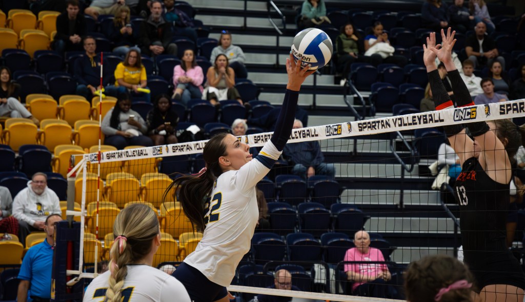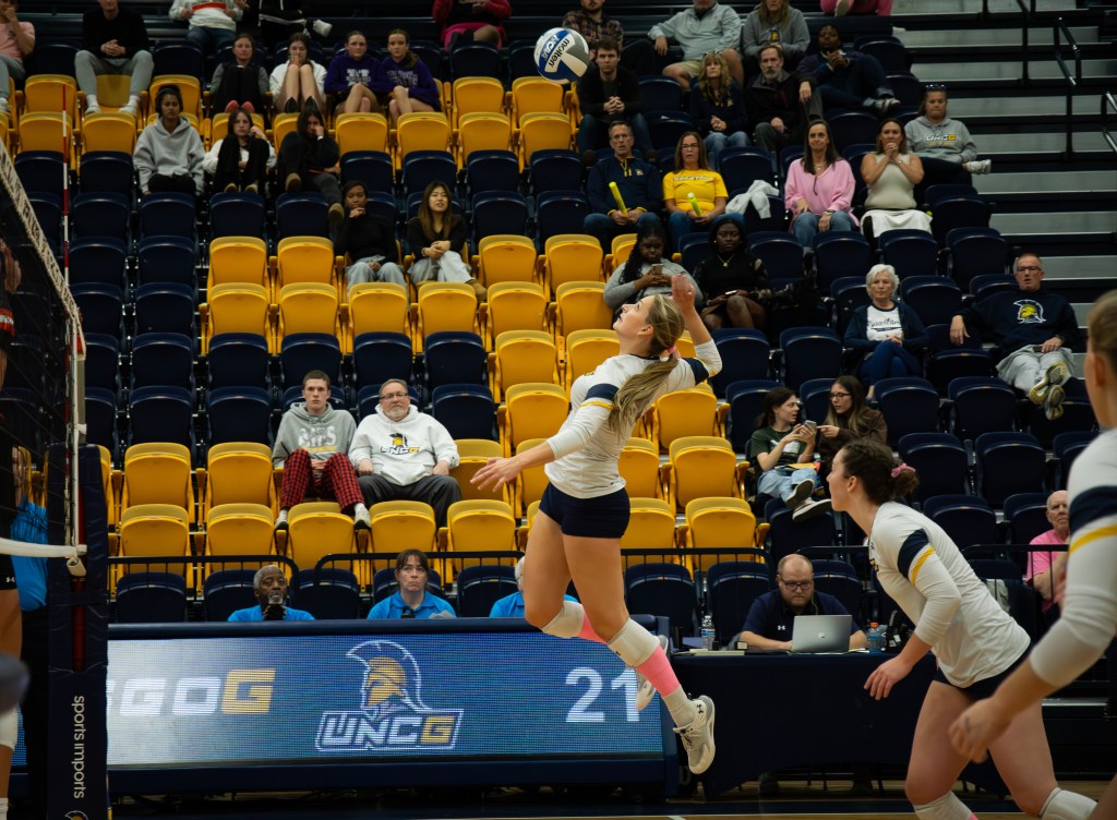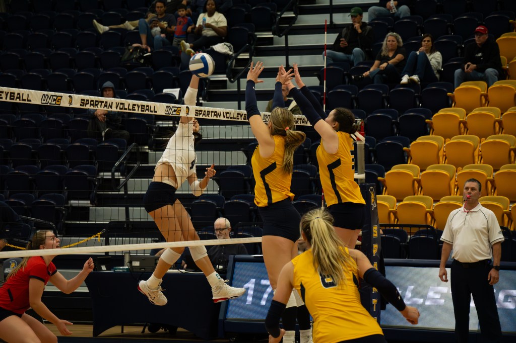 The match started off with UNCG claiming the first set in dramatic fashion with a score of 30-28. The Spartans would not hang on to this lead as they fell to the Bulldogs in the second set. UNCG wouldn’t back down, though, and won the next two sets, with the last set being a dramatic 26-24, to secure a victory in front of the electric home crowd.