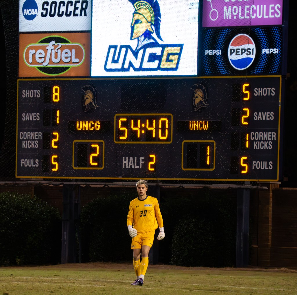 Throughout the first half, UNCG pressured UNCW’s side of the field, taking numerous looks at goal. These hard-fought efforts eventually paid off in the 30th minute as UNCG’s forward, Arnaud Tattevin, scored an impressive goal with crucial assists from Enzo Dovlo and Daniel Longo.