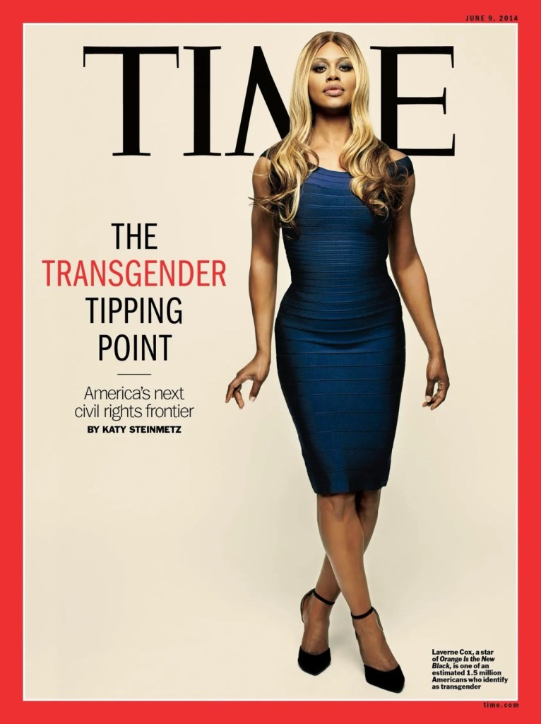 On Time’s most memorable cover, actress Laverne Cox strikes a confident and elegant pose in a form-fitting, navy blue dress, her head and shoulders blocking part of the TIME logo. In 2014, Cox was the most prominent trans actress in the business, having received acclaim for her role in Netflix’s hit series Orange is the New Black (2013-2019). The cover story’s title and subtitle stand out to Cox’s right: “THE TRANGENDER TIPPING POINT: America’s next civil rights frontier.”