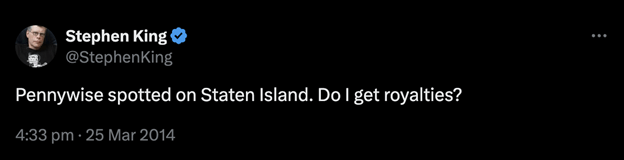 Creepy clown incidents began at least as early as 2013 when a college student in England dressed up as Pennywise from It as part of a performance art project. A few months later, a copycat was spotted several times in New York. Stephen King tweeted in response to these sightings, “Pennywise spotted on Staten Island. Do I get royalties?”