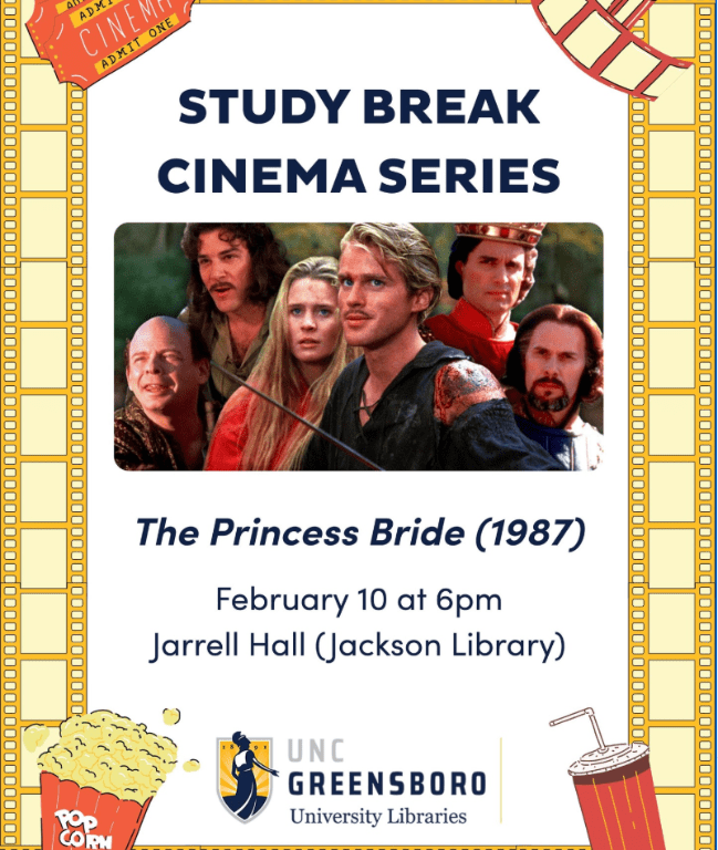 Join us in Jarrell Hall on the lower level of Jackson Library as we enjoy The Princess Bride (1987), directed by Rob Reiner. There will be free snacks! Open to all UNCG students, faculty, and staff.