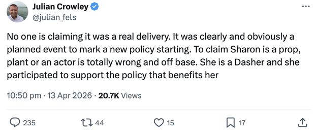 “No one is claiming it was a real delivery. It was clearly and obviously a planned event to mark a new policy starting. To claim Sharon is a prop, plant or an actor is totally wrong and off base. She is a Dasher and she participated to support the policy that benefits her[.]”