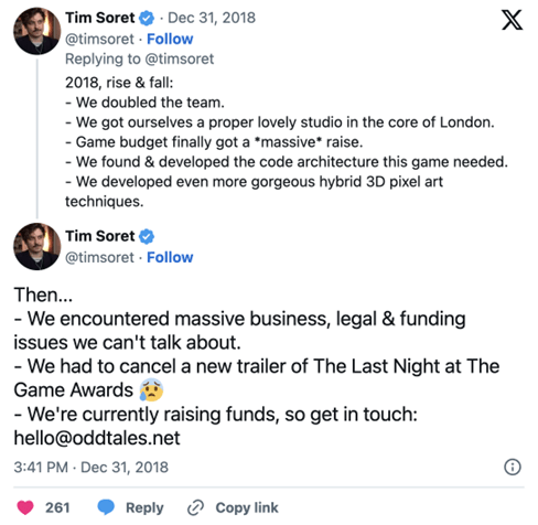 Soret disavowed the tweets. At the time of writing, The Last Night has yet to be released. However, Soret revealed in late 2018 that the game had faced “massive business, legal, & funding issues,” and it’s unclear how much these issues had to do with his milkshake duck status, so onlookers should make no assumptions.