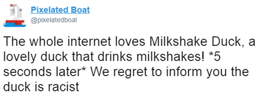 On June 12, 2016, artist Ben Ward, known on Twitter as @pixelatedboat, made Internet history with a tweet describing “milkshake duck”: “The whole internet loves Milkshake Duck, a lovely duck that drinks milkshakes! *5 seconds later* We regret to inform you the duck is racist”